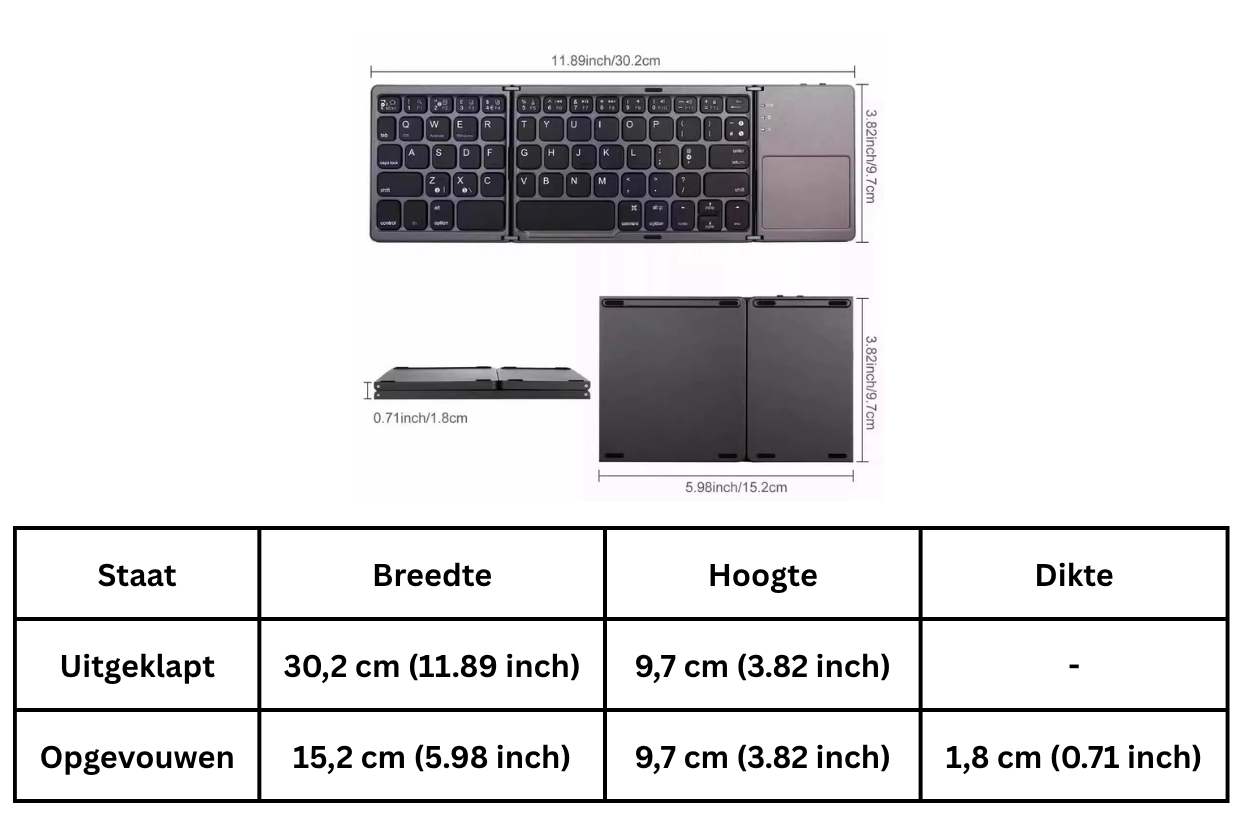 - Afmetingen (ingeklapt): 15 x 9,5 x 1 cm