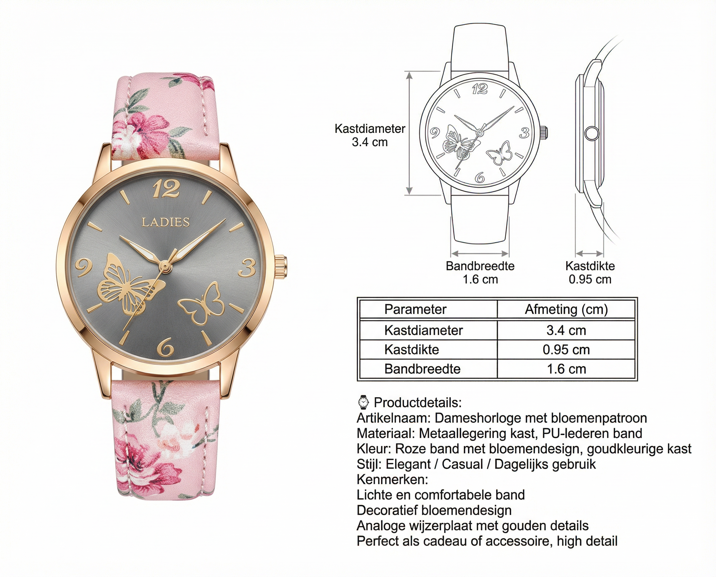 De fijn geïllustreerde bloemen op de wijzerplaat maken elk moment bijzonder. Een poëtisch detail dat het verschil maakt.